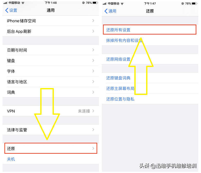 以上都设置过iPhone手机还是很卡、内存不足,那就进入设置---通用---还原---选择还原所有设置,这样可以腾出大量的空间,而且不会删除手机里的照片,视频等文件。