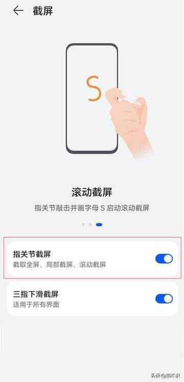 打开【指关节截屏】右侧的开关,在屏幕上使用指关节敲击屏幕并画S即可滚动截屏。