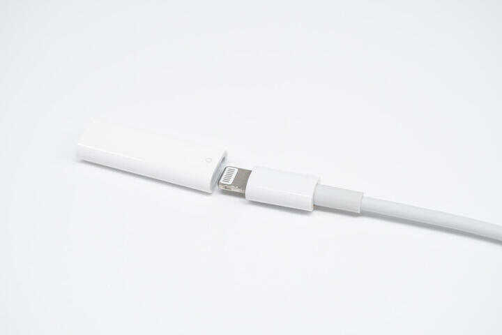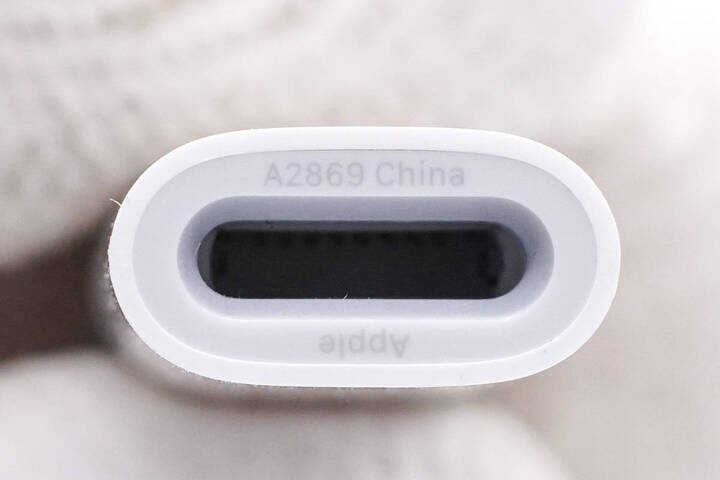 Lightning 接口端子内部与 iPhone 充电接口设计相似,支持正反盲插;端口两侧均印有转接器的型号以及苹果名称字样。