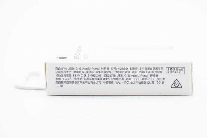 苹果转换器的包装一如既往,白色简约设计风格,左上角印有USB-C to Apple Pencil 字样。