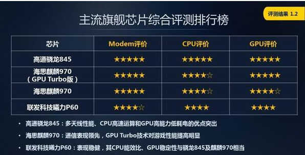 具体来说,在主流旗舰芯片综合测试排行榜中,高通骁龙845位列第一,海思麒麟970位列其后,至于联发科P60这款处理器,也进入到这份排行榜中。在Modem评价上,高通骁龙845和海思麒麟970都是五颗星的评价,而联发科P60则是四星半。在CPU评价上,高通骁龙要领先于海思麒麟970和和联发科P60。而在GPU评价上,高通骁龙845虽然领先于华为麒麟970和联发科P60,但是,对于海思麒麟970(GPU Turbo版),在评价上也达到了五颗星,和骁龙845芯片一样。