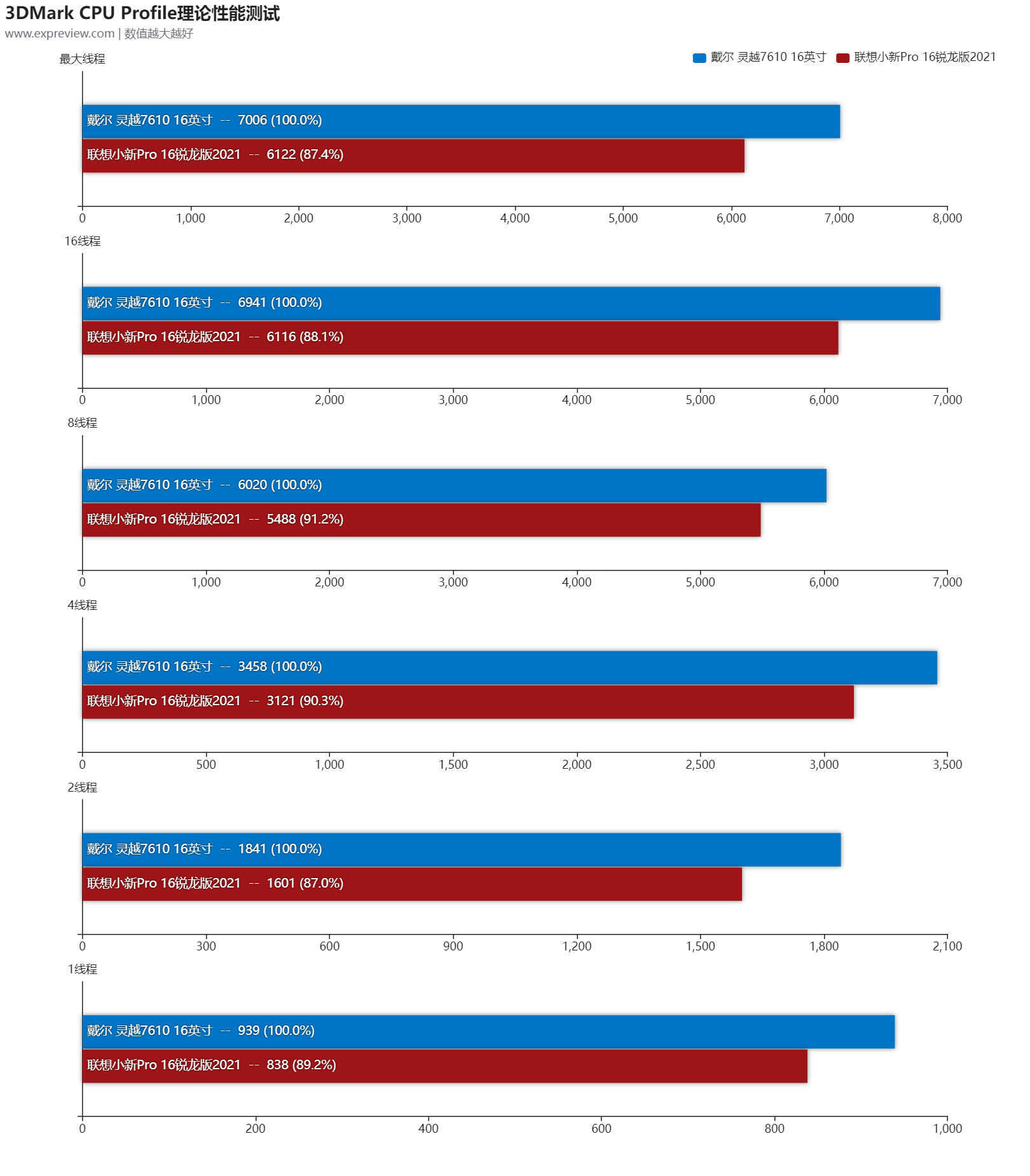 3DMark CPU Profile理论性能测试的结果比较稳定,并且可以简单明了的看到不同线程下的性能区别,在3DMark CPU Profile测试中,搭载Core i7-11800H的戴尔灵越7610相对于搭载Ryzen 7 5800H的联想小新Pro 16形成了碾压的姿态,在各个线程下都有较大的领先,平均领先幅度超过了10%。