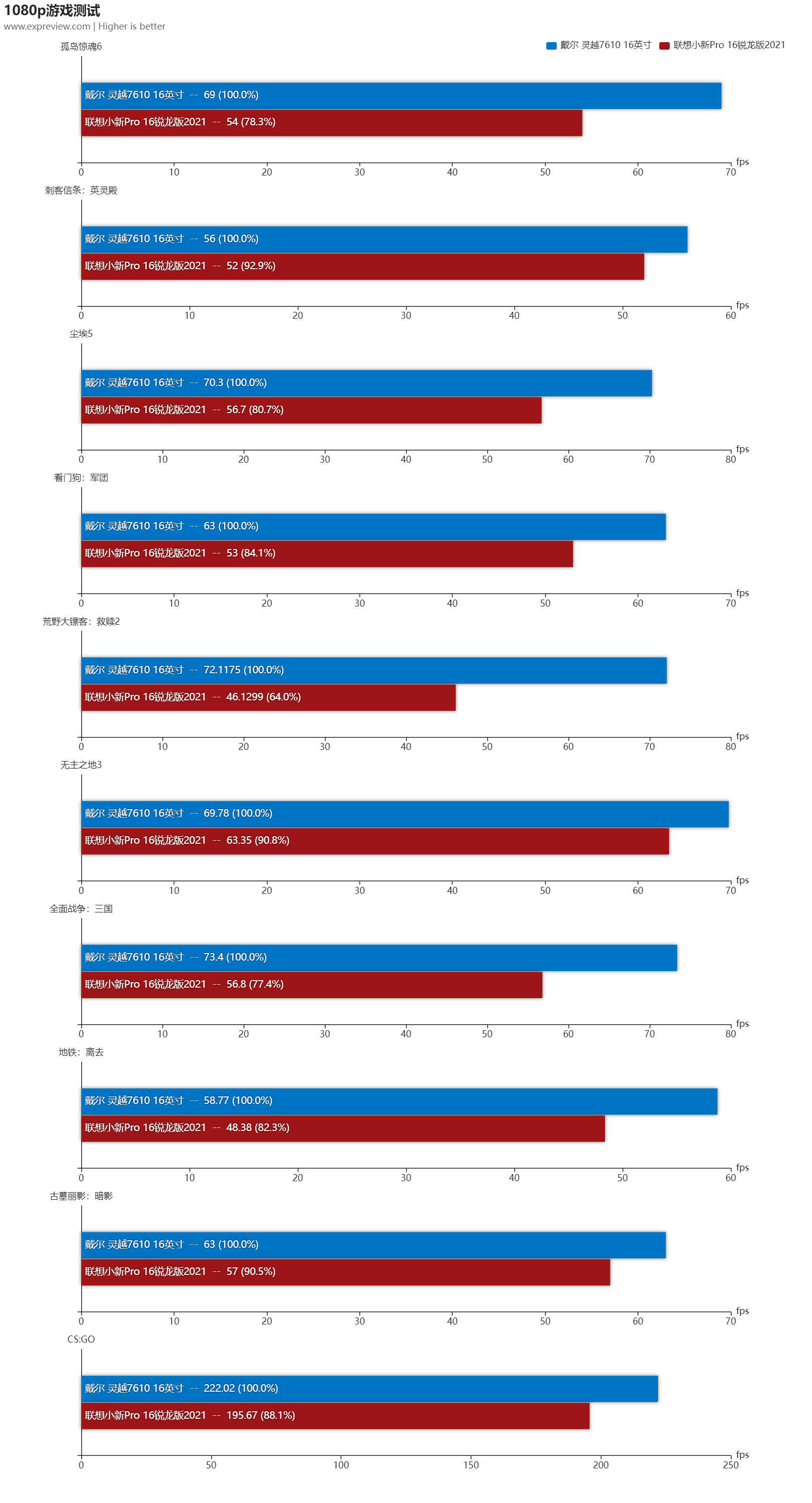 对于会用笔记本来运行游戏的用户来说,在实际应用的测试中游戏测试的意义最为具有参考性,而游戏测试的结果出现了一面倒的情况,而且差距非常之大,搭载Core i7-11800H的戴尔灵越7610大幅度领先于搭载Ryzen 7 5800H的联想小新Pro 16,在《荒野大镖客:救赎2》这项游戏中更是领先了多达56%的幅度,在《孤岛惊魂6》和《全面战争:三国》中也有非常明显的领先。