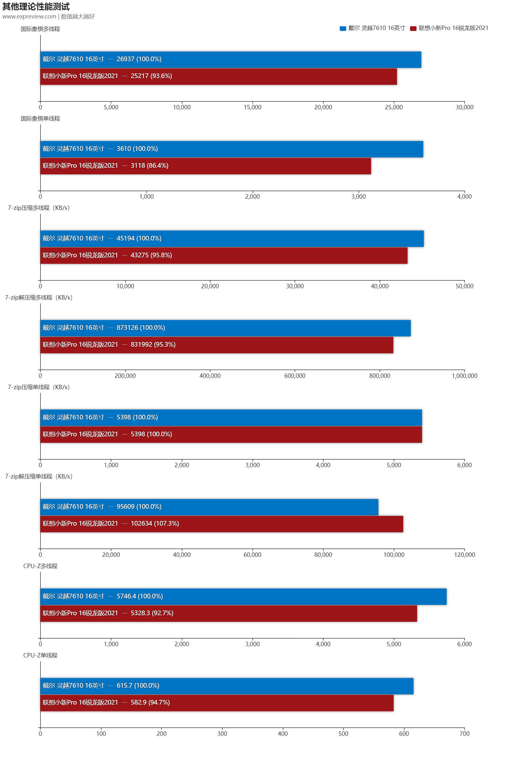 其他的多项理论性能测试中,搭载Core i7-11800H的戴尔灵越7610相对于搭载Ryzen 7 5800H的联想小新Pro 16各有胜负,不过总的来说还是搭载Core i7-11800H的戴尔灵越7610胜出的项目更多。