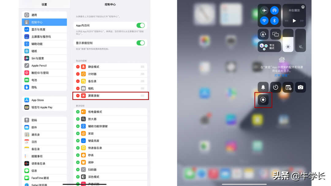 只需打开iPad【设置】-【控制中心】,在“更多控制”中找到【屏幕录制】功能键,点击文字前面的绿色+号按钮,就会在“包含的控制”中找到【屏幕录制】功能键了。