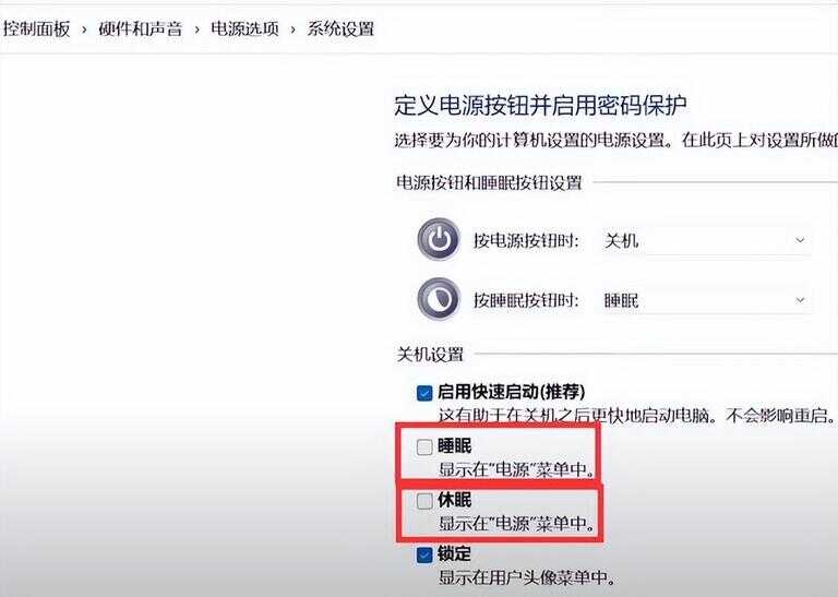 5、然后将下方的关机设置中“休眠”和“睡眠”功能都勾选上。勾选好之后,点击系统设置窗口底部的“保存修改”。