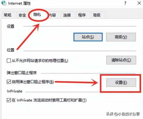 接着就会打开【Internet】属性,在这边我们首先点击上方的【隐私】,然后再选择【弹出窗口阻止程序】,在这里我们首先需要把【启用弹出窗口阻止程序】开关打开,然后再点击右边的【设置】按钮