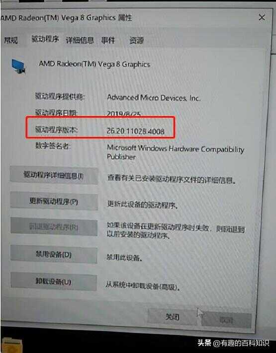 6. 打开“设备管理器”后,展开显示适配器,右击“Radeon(TM) Vega 8 Graphic”属性,驱动程序,核实当前驱动版本是否是“26.20.11028.12001”。