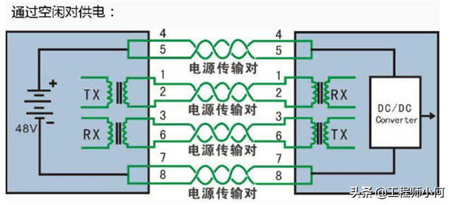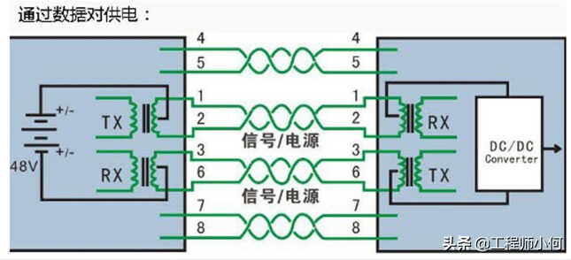 通过数据对供电,利用信号线(1,2,3,6)同时传递数据信号和48V的电源