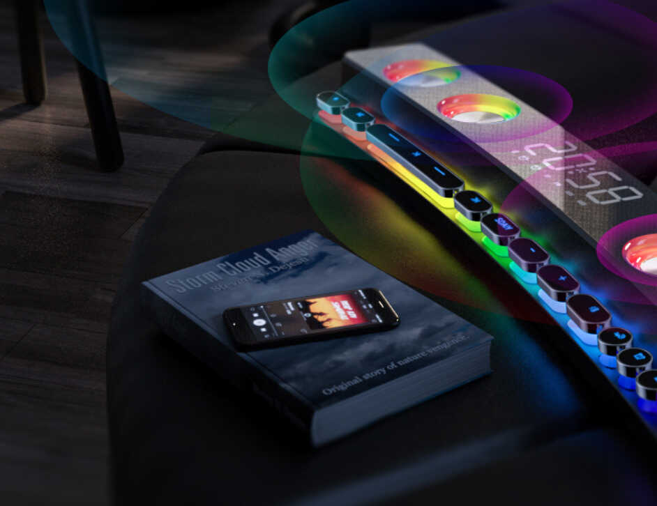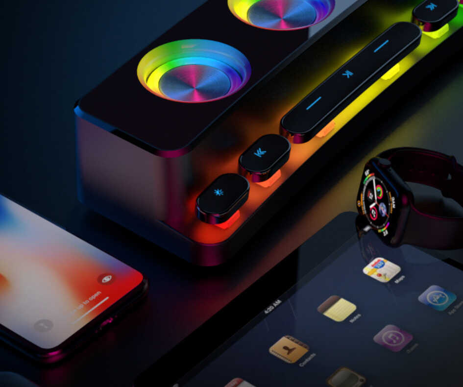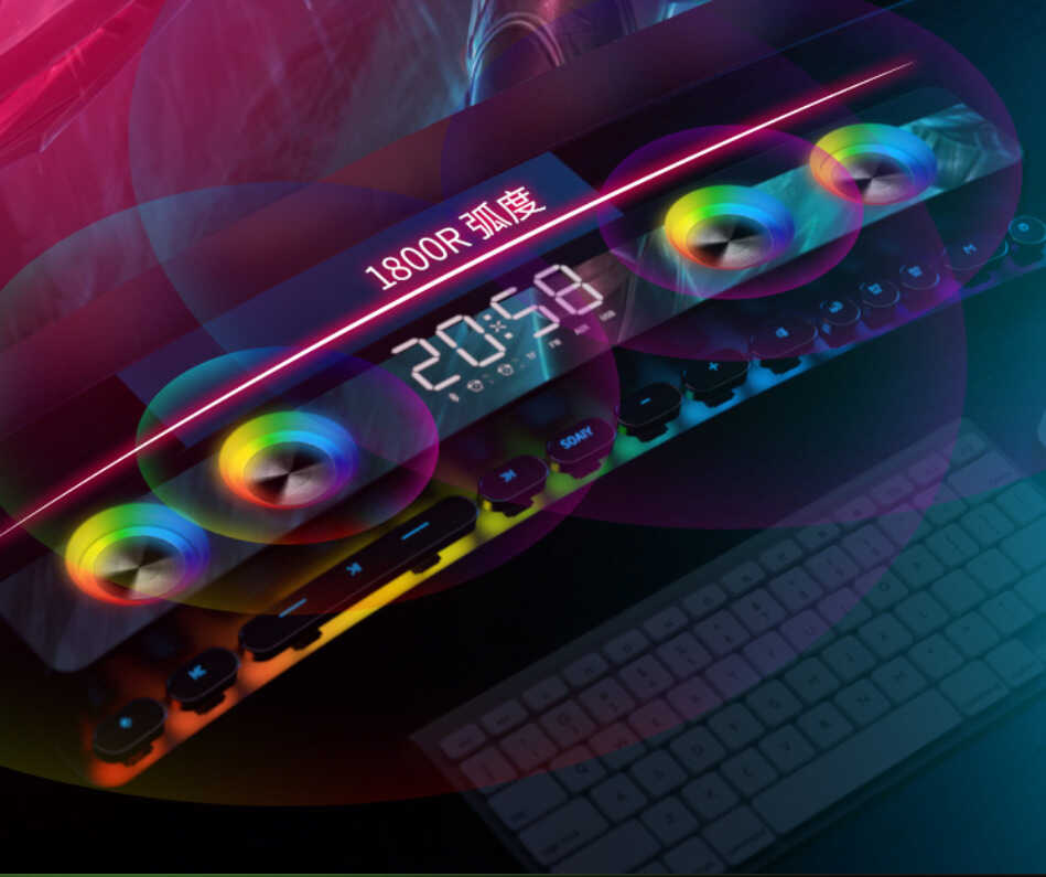 作为一款游戏音箱,索爱SH39整体外形可以说极为炫酷。其外观最吸引人的地方就在于1800R曲面屏和炫彩镭射灯光,彻底告别了以往蓝牙音箱产品刻板的线条及沉闷感,在这样的氛围中玩游戏,仿佛自己就置身游戏世界,临场感极佳。