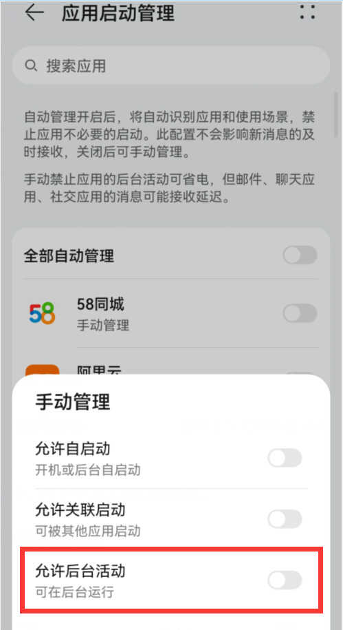 想要关闭哪个软件的“后台运行权限”,就点击它右侧的开关,屏蔽的底部就会弹出一个“手动管理”的新窗口(如上图)。我们把这个窗口中的“允许后台活动”右侧的开关给关掉,变成灰色,就可以了。其它软件以此类推。