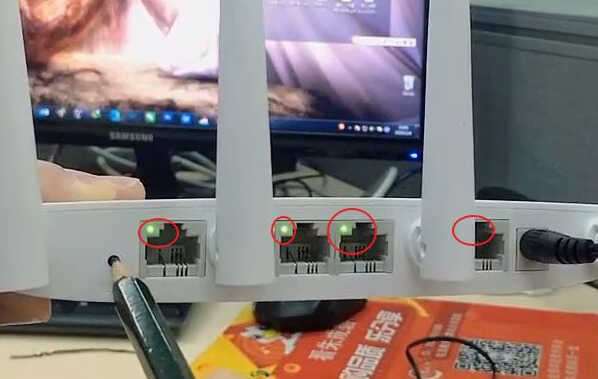 4、按住几秒钟之后,就会看到所有网线接口上的灯都亮了,这个时候就可以松开了。