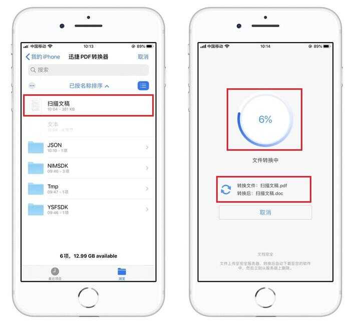 2.随后从手机文件夹中,找到刚才扫描的PDF电子文档,直接点击文件,就能自动进入转换页面,从这里将会看到,文件转换的进度,以及文件转换的格式详情。