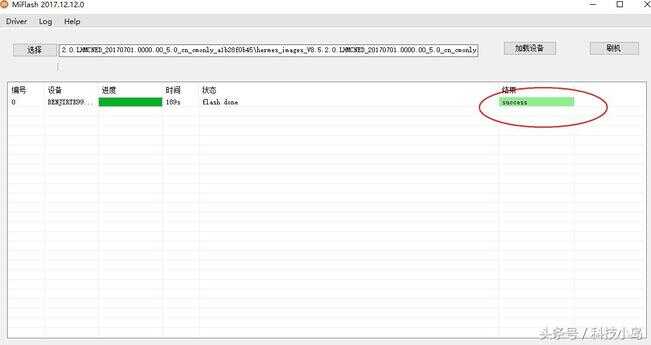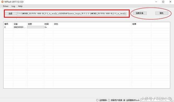 打开通用刷机工具XiaoMiFlash.exe运行,将上面复制的地址栏的地址到下图红色区域位置,点击圈中选部分"加载设备",刷机程序会自动识别手机,点击"刷机"开始刷机。