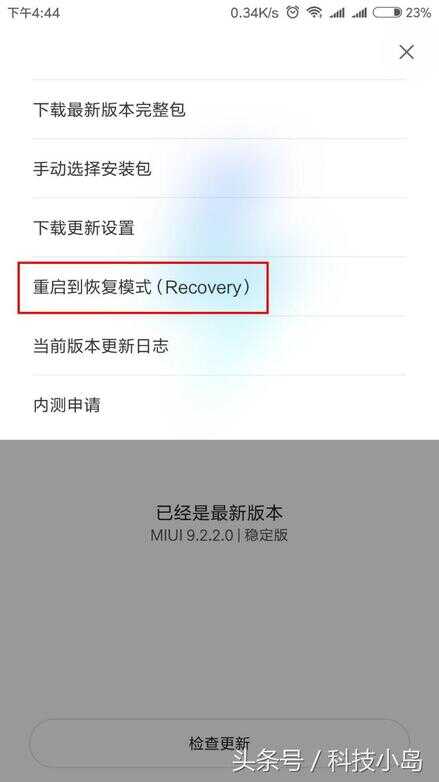 同样是下载下载最新的MIUI安装包,开机状态下:进入"系统更新",点右上角"..."选择"重启到恢复模式(Recovery)",点击"立即重启" 进入Recovery模式。 如果是关机状态下:同时按住音量上+电源键开机,屏幕亮起松开电源键保持长按音量键 进入Recovery模式。