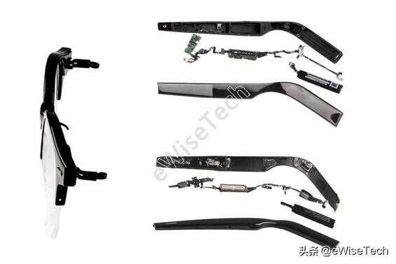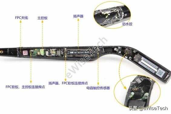 左右眼镜脚内组件由FPC软板、扬声器、主控板和电池组成,所有组件采用双面胶和少量泡棉胶贴合固定在壳内。眼镜脚内侧有少量防水胶,尾部的电池采用点焊方式连接FPC软板,并采双面胶和黑色胶纸固定,连接点表面有透明软胶覆盖。