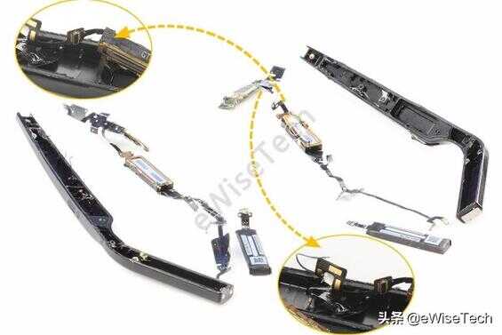 歌尔提供的扬声器模块采用泡棉胶贴合固定,通过FPC软板上与主控板连接,软板与扬声器之间采用点焊方式连接。主控板下方软板为板载天线,软板表面用黑色胶纸固定。