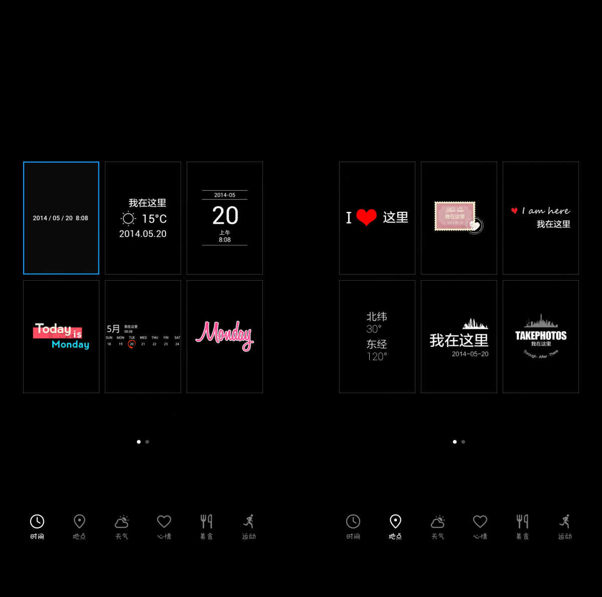 这里有很多种类型的水印,除了时间和地点,有天气、心情、美食、运动,喜欢哪个直接点击就能使用,我这里选择一个带时间和地点的。