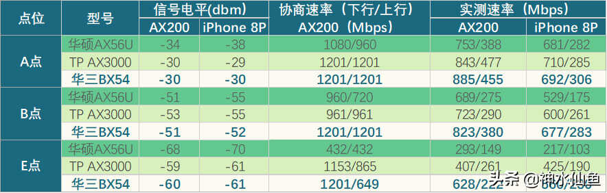 但奇怪的是,在距离最远且隔两堵墙的E点,明明功率最小的AX3000,实际覆盖电平甚至超过了BX54?