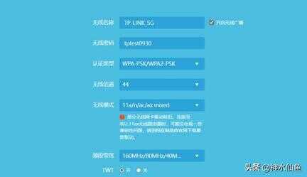 选择44频点作为中心频点,频段带宽160/80Mhz自适应,同时打开TWT和OFDMA开关。