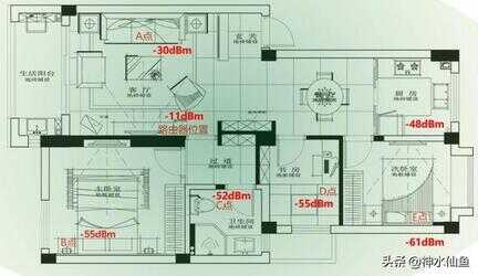4、测试方法:房子内固定5个常用点测试,记录平均电平、速率和时延;