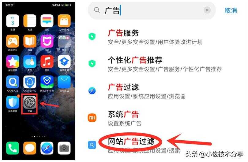 首先打开设置,然后输入【广告】俩字,接着选择【网站广告过滤】