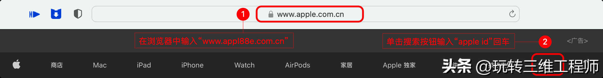 步骤一:将浏览器输入苹果官网地址:https://www.apple.com.cn,按下图步骤执行,如图1-1所示。