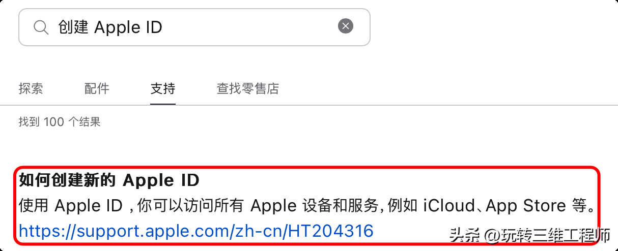 步骤二:点击“搜索”按钮,在对话框输入“apple id”,选择“创建Apple ID”,如图1-2所示。