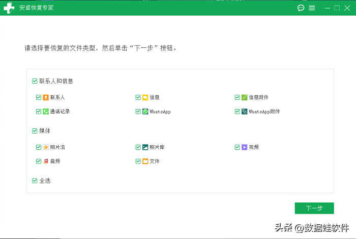 专业的事情,我们可以交给专业的工具来操作,这里小编要介绍一款备受推荐的软件:数据蛙安卓恢复专家。为什么是这款呢?很简单,这款软件能够帮助用户快速地恢复安卓手机中的通讯录、照片、短信、视频等多种数据,安卓恢复专家软件不仅能够从安卓手机内部存储恢复数据,还支持恢复SD卡数据。操作也简单,看一看: