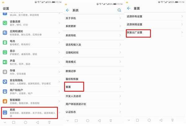 点击手机【设置】-【系统】-【重置】,在这里有三个选项,【还原所有设置】、【还原密码设置】以及【恢复出厂设置】,如果我们确定需要恢复手机的出厂设置,那么我们直接选择最后一个【恢复出厂设置】,然后点击【重置手机】最后输入华为账号密码以及点击确定即可。