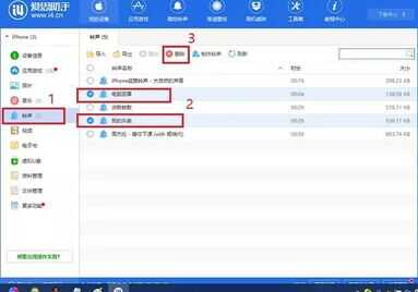 2、打开爱思助手工具,待助手识别到工具之后,点击左侧的“铃声”,接下来在右侧就可以看到我们之前导入的所有自定义铃声。删除很简单,只要勾选上需要删除的铃声(支持多选),然后点击上方的“删除”按钮就可以了,如图所示。