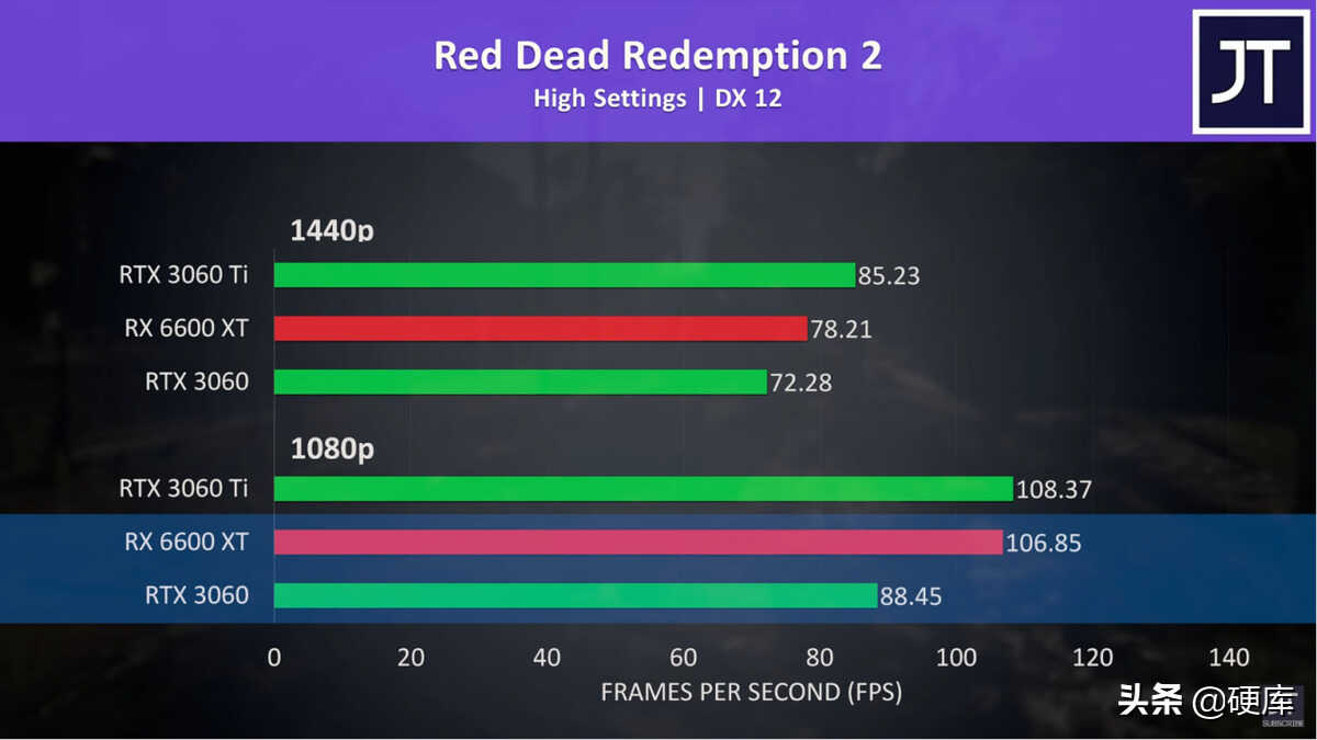 第三款游戏为荒野大镖客2,在1080p分辨率下,6600xt比3060高18.4帧,并且再次和3060ti站上了同一水平线,仅仅相差2帧。在2k分辨率下三者的差距比较均衡,6600xt比3060高了5.93帧,比3060ti低了7帧。
