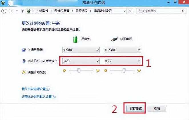 5、在两个时间选项由默认的15分钟、30分钟,改成从不,点击保存按钮,如下图所示: