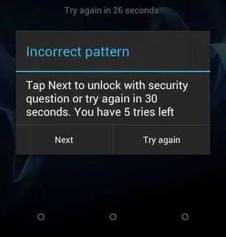 如果你的设备当前运行的是 Android 4.4 或 更低版本,那么你可以尝试 “Forgot Pattern(忘记模式)” 功能来重置锁屏密码。当你超过 5 次尝试解锁失败后,你会看到一条提示信息,“请在 30 秒后重试”。这时你会看到屏幕底部有显示 “Forgot Pattern(忘记模式)” 的按钮,我们来点击该按钮。
