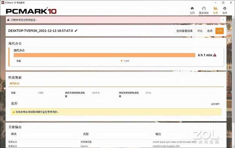 在全程链接Wi-Fi、电池模式为“最长续航”的情况下,使用PCMARK 10办公模式进行续航测试,最终的续航成绩为6小时1分钟,表现尚可,开个长会、应个急是完全没有问题的。