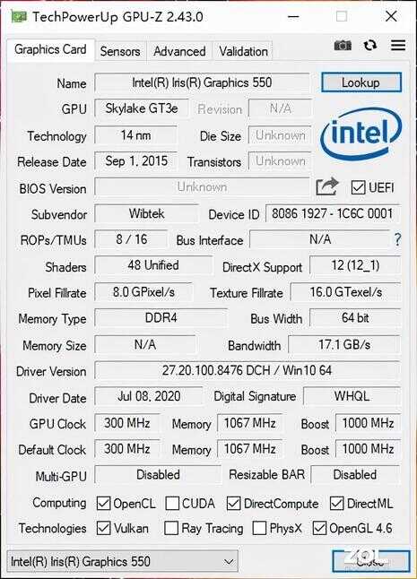 GPU方面为CPU中集成的核芯显卡,Intel Iris锐炬550,锐炬的性能肯定要比当时的Intel UHD这种普通核显要强上一些,毕竟是当年Intel的旗舰了。