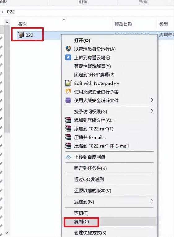 4、打开解压后的文件夹,鼠标右击【022】选择【复制】。