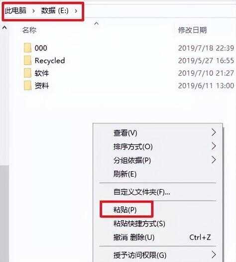 5、打开需要加密的文件夹,鼠标右击选择【粘贴】(我这里将对电脑磁盘E盘下的文件夹进行加密处理,所以直接打开E盘)。