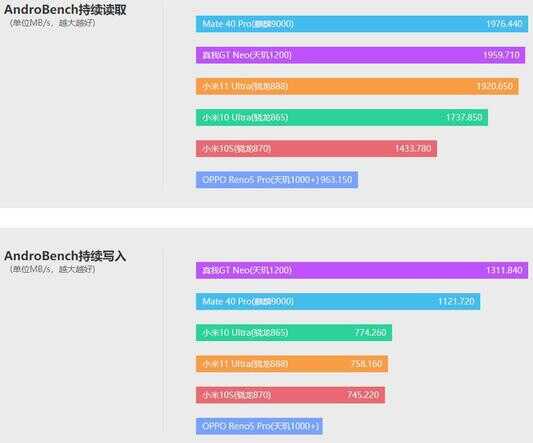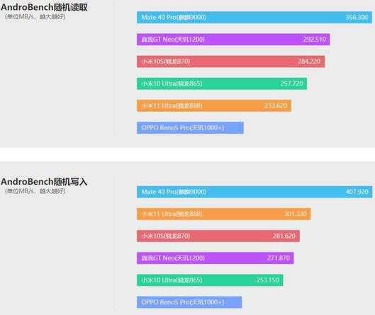 - 闪存读写性能表现不错。终于有UFS 3.1,且不会像高通平台那样受加密速度限制,连续读轻松反杀高通全系,随机读写速度也还不错。