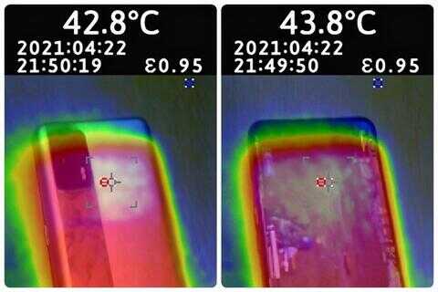 室温28度,25分钟《和平精英》(HDR高清+极限帧数+抗锯齿,但实际上被限制在40帧)后,真我GT Neo背面最高温42.8度(在相机右侧),正面最高温43.8度,表现OK。因为是塑料中框和塑料后盖,完全不会有热流涌动的感觉,温温的,舒服!