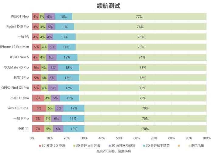 要注意的是,真我GT Neo在《和平精英》 中被限制在40帧,所以游戏耗电偏低。真我GT Neo其余部分的续航表现虽比骁龙870的一加 9R稍弱,但好于iQOO Neo5(骁龙870),同时抛开了除K40 Pro之外的一众骁龙888旗舰。