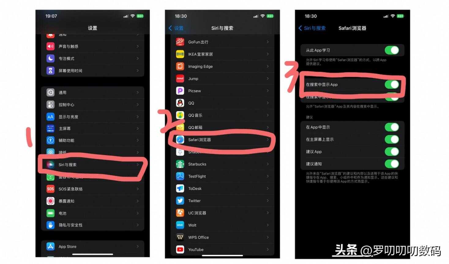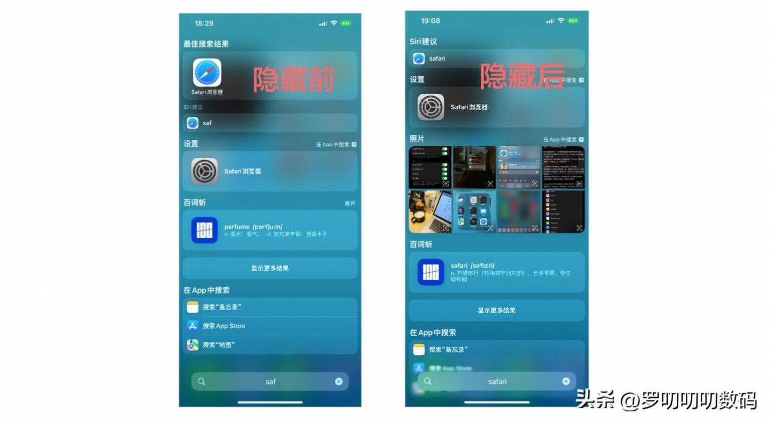 有的人会说,这两种方法虽然可以简单让app看不见,当用「搜索」功能,还是能直接通过搜寻找到隐藏的app,那这不是自欺欺人吗?但「搜寻」结果其实也可以隐蔽起啦,那就能避免在iPhone里搜索找到隐藏的app了,具体大家可以参考以下步骤: