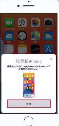 将两部iPhone开机,将新iPhone放在旧iPhone旁边。此时,旧iPhone屏幕出现【设置新iPhone】弹窗,点击【继续】按钮。