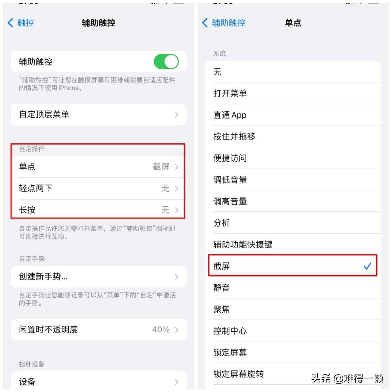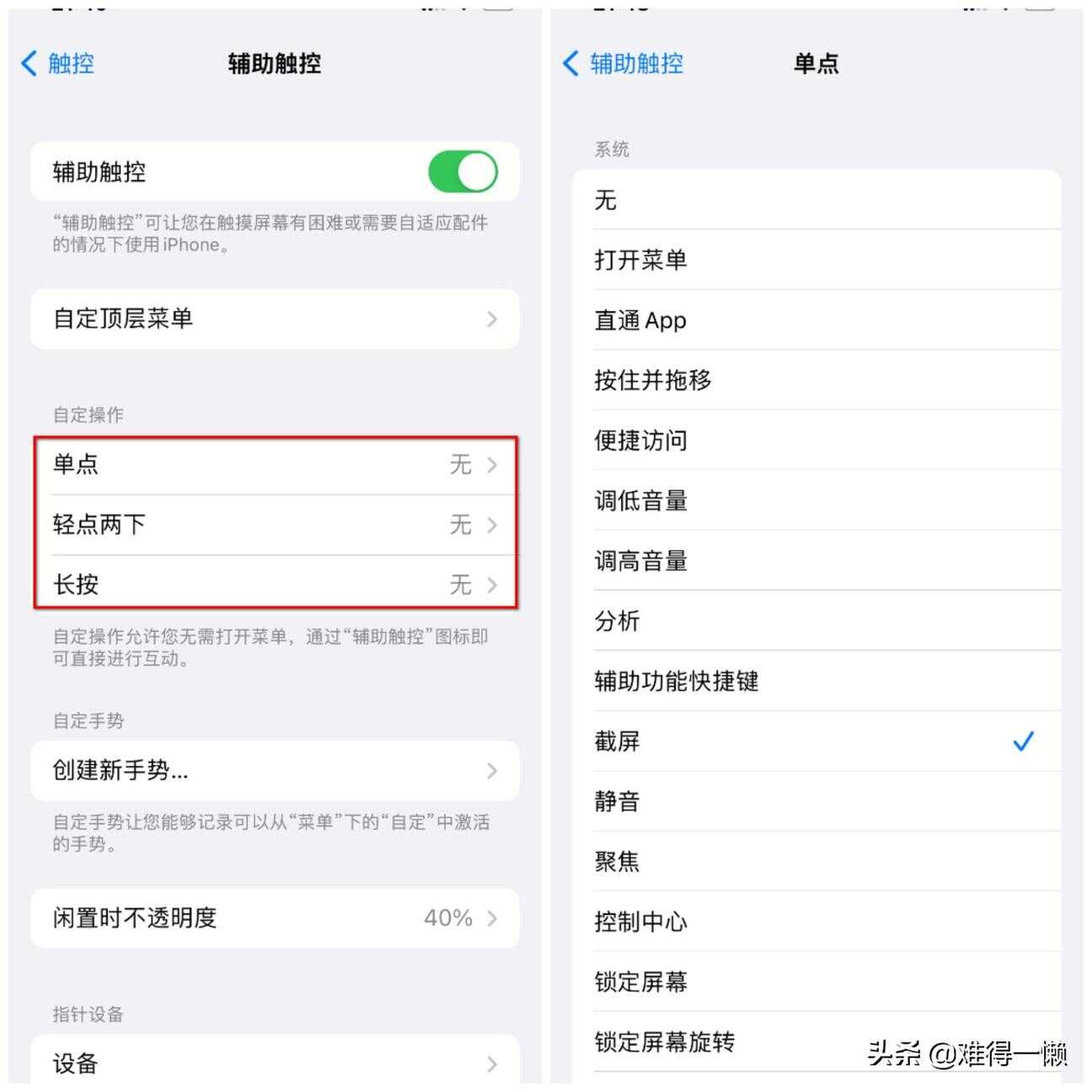 打开辅助触控界面,在自定操作版块选择操作的方式,选择单点方式,打开之后设置为截图。