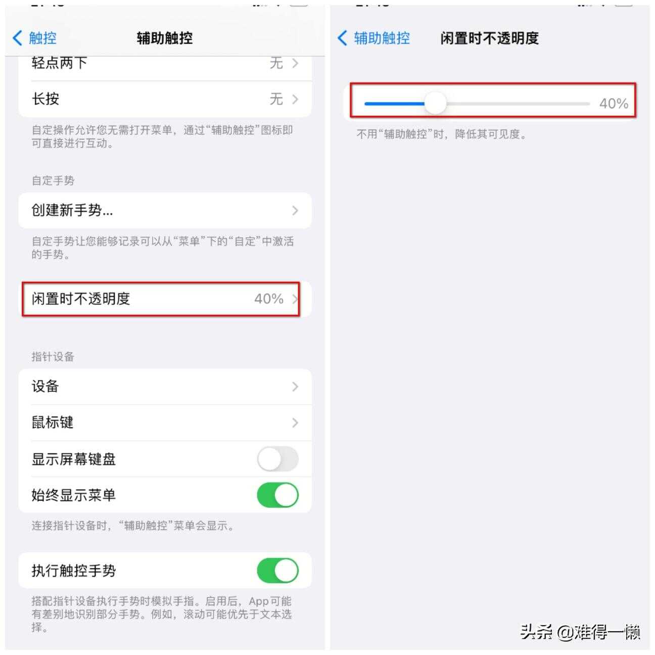 在辅助触控界面下方选择闲置时不透明度,打开之后设置这个小圆圈的透明度。