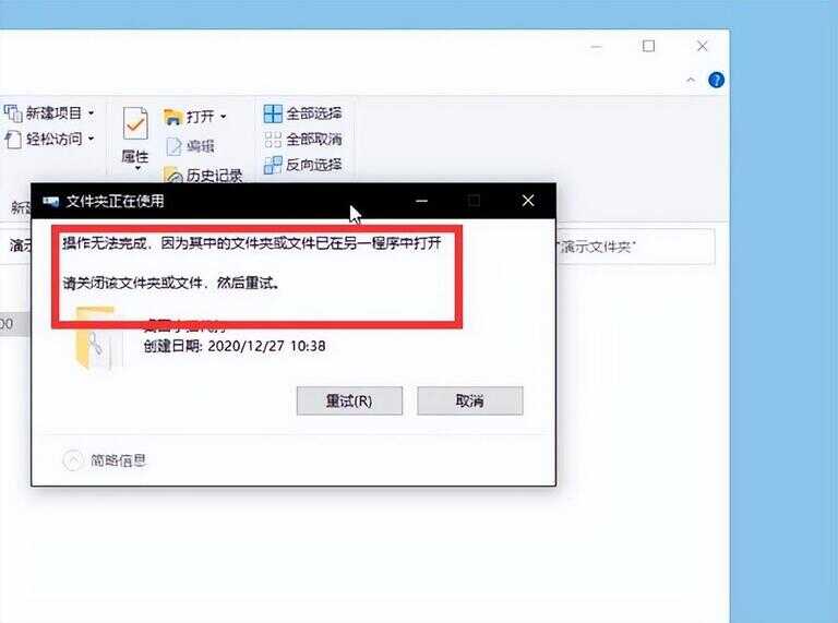 遇到系统提示为文件夹正在使用,操作无法完成,因为其中的文件夹或文件已在另一个程序中打开。这表示该文件处于程序占用状态,我们可以通过重新启动计算机再进行删除,就可以了。