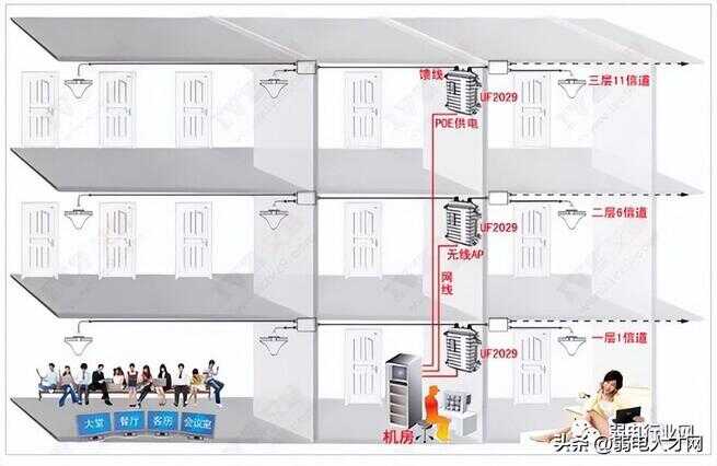 避免同频干扰最有效的办法,相邻的AP按1、6、11相互隔开,同一信道间隔距离尽量远。移动和电信采用专业天馈式覆盖,工业级无线AP通过馈线分接4~8个天线,1个AP占用一个信道覆盖一层楼或整栋楼,有效的避免同频干扰。如图,一层用1信道,二层用6信道,三层用11信道,这样不会产生同频干扰。