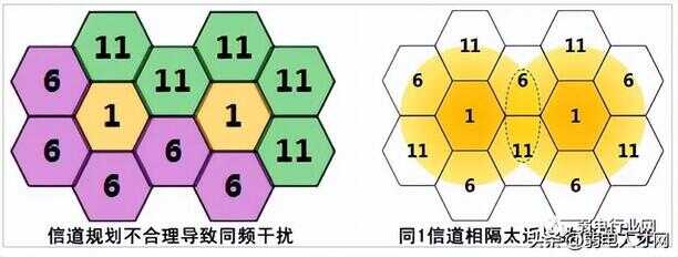 在无线WiFi覆盖工程中,为了减少信号盲区,不得不部署多个AP来完成无线覆盖的重叠区域。要注意合理的规划和使用无线信道,在2.4G频段下,相邻的AP按1、6、11相互隔开。左边图同频干扰严重,右边图改善一些,无线信号重叠部分会导致轻频干扰。