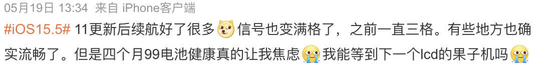 总之大部分iPhone13或者iPhone12系列的机型用户,升级到iOS15.5,要么是续航感知不明显,要么是觉得掉电快的,相比之下,一些iPhone11的机主反馈则要更好一些,比如这位小伙伴评价,iPhone11更新后续航好了很多,信号也变满格了,之前一直三格,有些地方也确实流畅了。