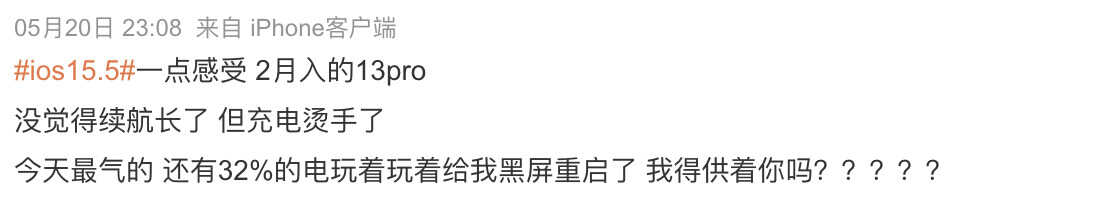随后我又在网上看了看,部分小伙伴升级后的评价,有今年2月份入手的iPhone13 pro用户表示,没觉得续航长, 但充电烫手了。
